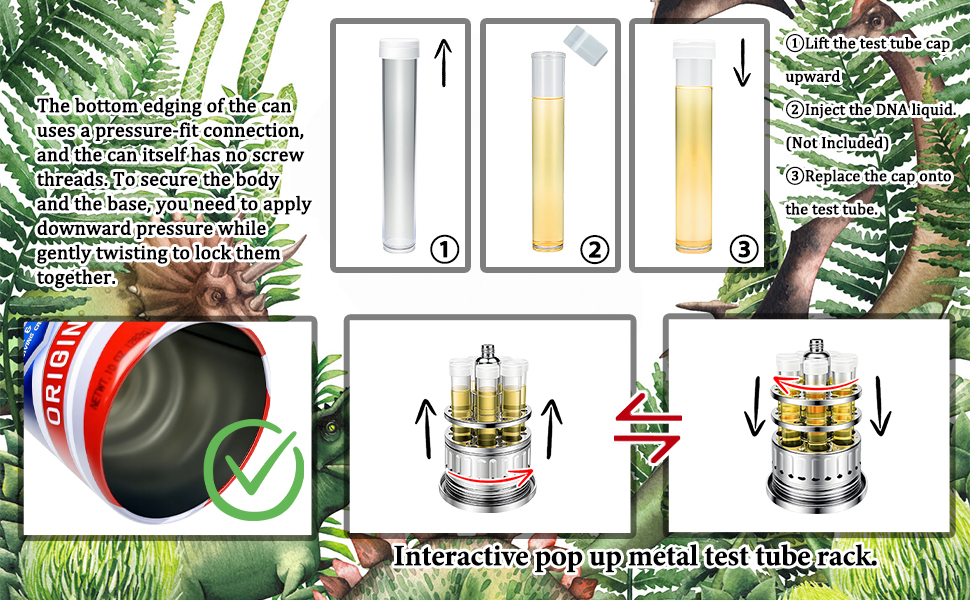 - Interactive Metal Test Tube Rack Design: Inside the dinosaur DNA can is an interactive pop-up metal test tube rack that allows you to remove and replace the dinosaur DNA test tubes. The tube slot “shelves” pop up when you turn them. Each dinosaur DNA test tube can be opened and filled with liquid, offering an engaging, hands-on experience that enhances the overall realism and interaction. The DNA solution is not included-you can DIY it yourself.
